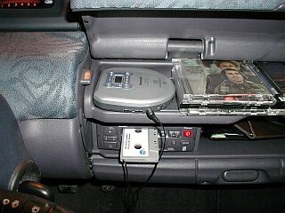 Der Walkman liegt auf der oberen Ablage im Handschuhfach, er wird noch mit Batterien betrieben. Später möchte ich den Walkman über das Bordnetz betreiben, habe aber noch nicht nach dem Strom gesucht. Im Ohrhörerausgang ist ein Kassetten-Adapter eingesteckt, der bei Bedarf ins Kassettenfach des Radios eingeschoben wird. So kann ich meine CDs hören. Der Klang ist in Ordnung.