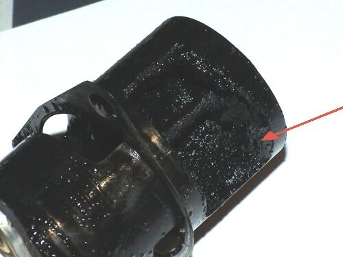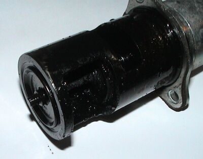 EGR Ventil nach dem Ausbau. EGR ist voellig mit dicken, zaehen Ablagerungen bedeckt. Pfeil zeigt ca. 7 Millimeter dicke Ablagerungen, die anscheinend das Schliessen des EGR beeintraechtigt haben.. |